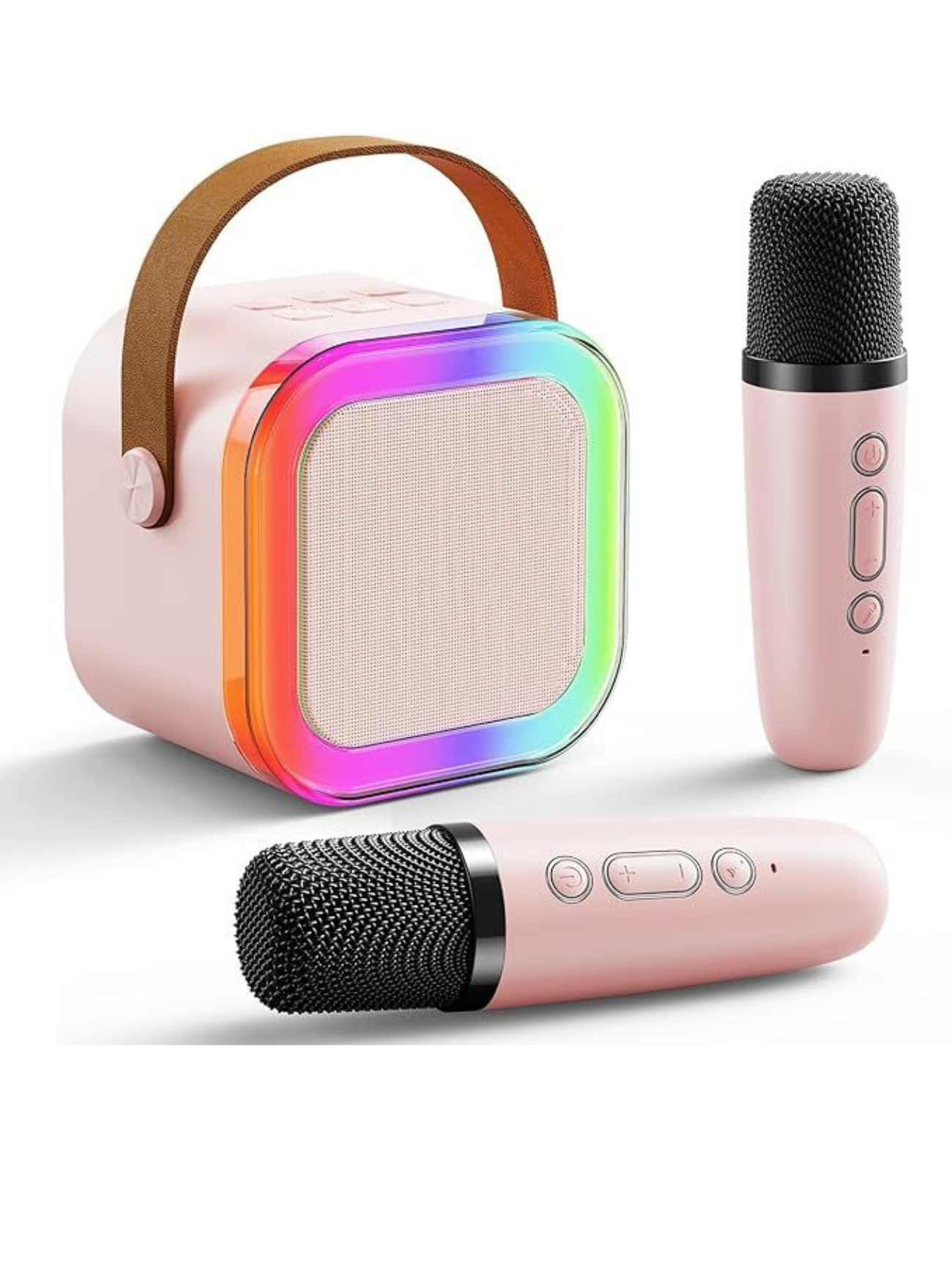 A stylish portable speaker with LED lights and a wireless microphone for karaoke, music, and parties.