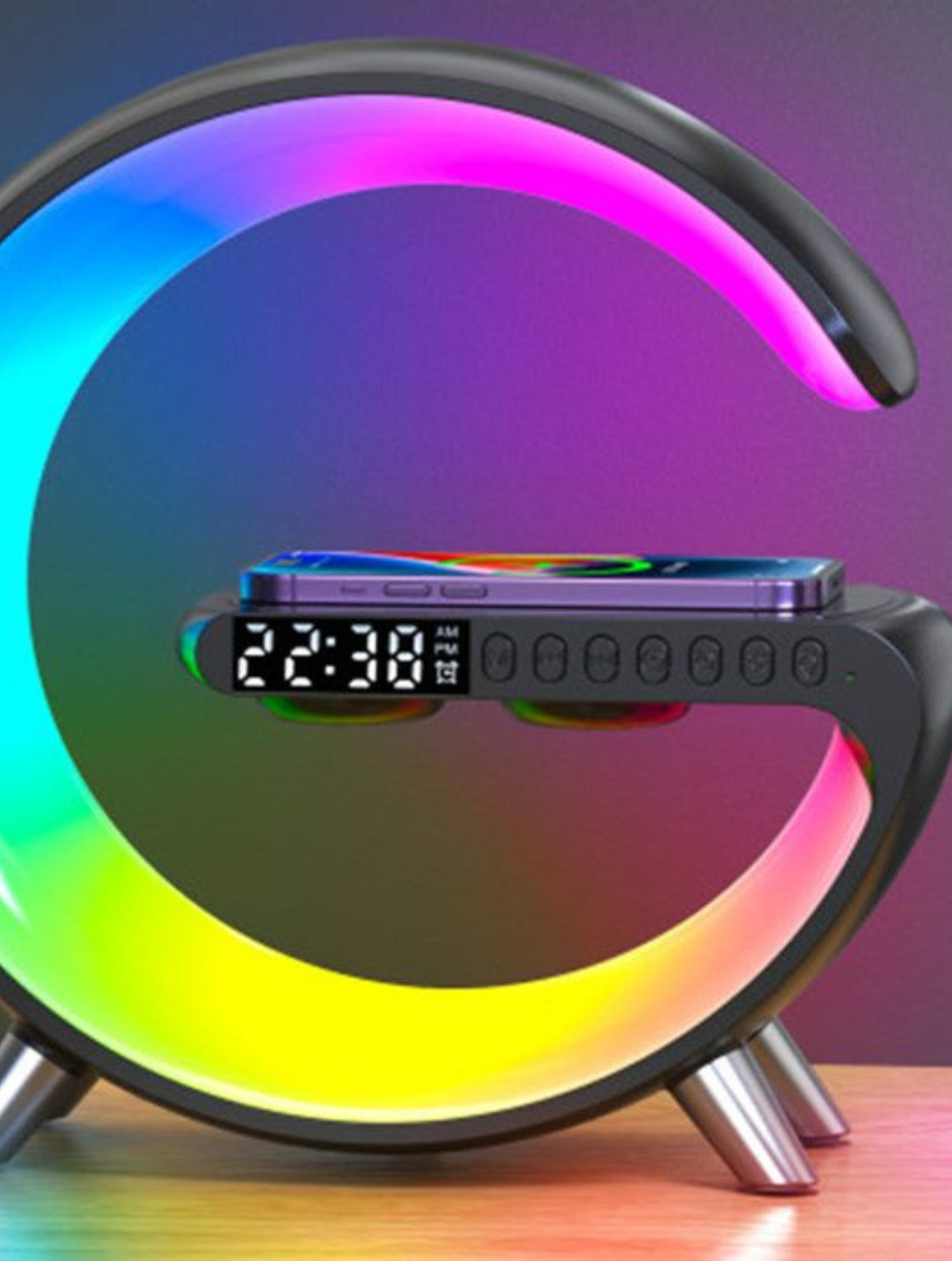 A futuristic LED ring lamp with wireless charging, digital clock, and ambient lighting—perfect for your desk or bedside.